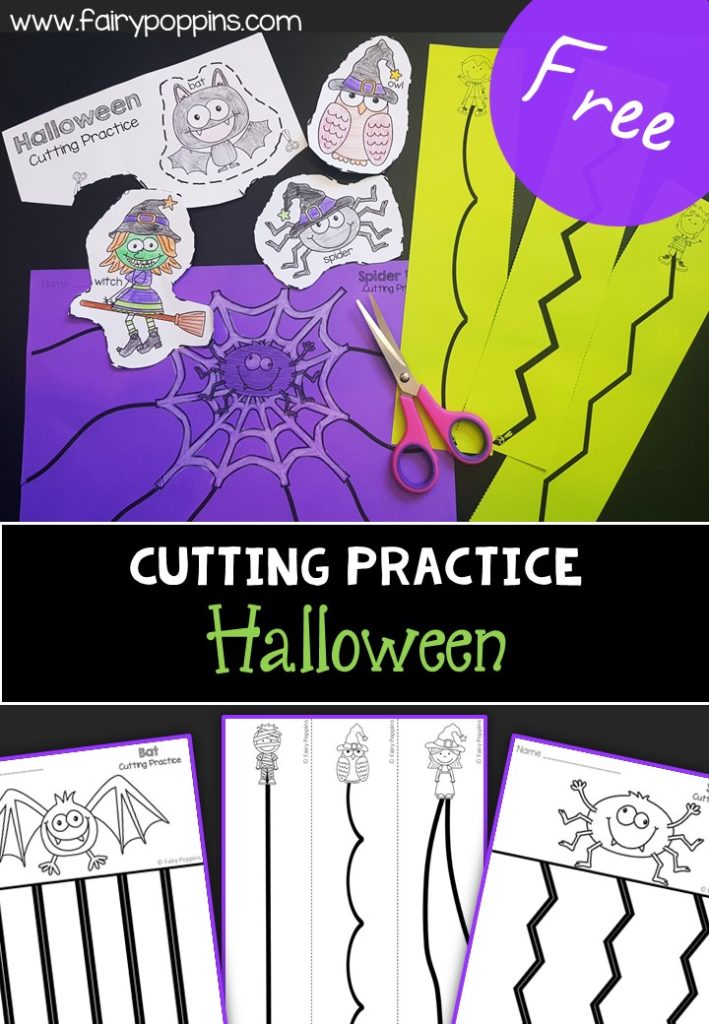 These Halloween cutting practice worksheets look great printed on colored paper such as neon green or purple. Kids can cut along the various lines or around the Halloween pictures.